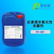 PO-881是反渗透水系统专用杀菌剂,对微生物细胞具有极强的穿透能力,并对微生物的细胞组织产生分解破坏作用,对反渗透设备中细菌、真菌、藻类等微生物有极强的杀灭和抑制作用。 (1)非氧化性杀菌剂,迅速有效的杀菌作用; (2)对细菌形成的粘泥有一定的剥离作用; (3)与所有的膜都能兼容; (4)适用pH范围广,生物降解性好,不污染环