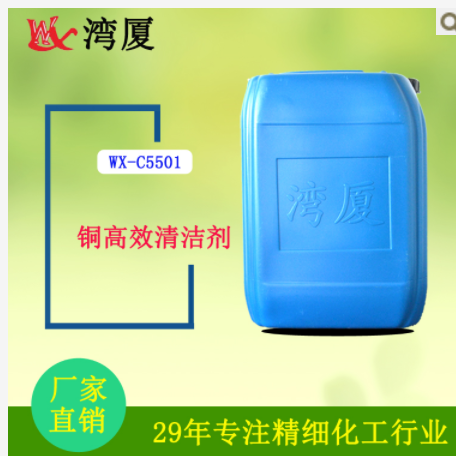 WX-C5501铜高效清洗剂是由一种由阴离子型和非离子表面活性剂, 助洗剂、水质软化剂、金属缓蚀剂及其它助剂所组成的高效除油剂。本产品对动植物油和矿物油具有良好的去除能力,适合紫铜、黄铜等金属制品在常温或中温下的油污与氧化物的清洗。