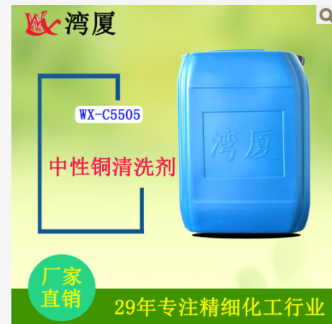 WX-C5505中性铜清洗剂是由一种由阴离子型和非离子表面活性剂, 助洗剂、水质软化剂、金属缓蚀剂及其它助剂所组成的高效清洗剂。本产品对各种油品具有良好的去除能力,适合紫铜、黄铜等金属制品在中温下的油污与氧化物的清洗。
