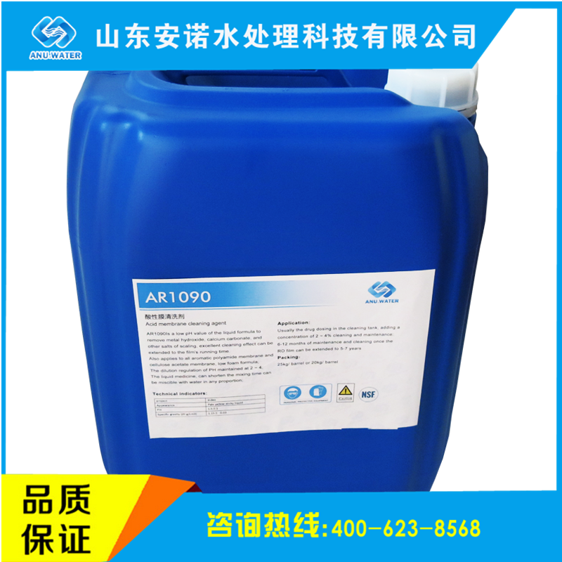 反渗透系统运行的稳定性取决去原水水质的预处理的水平。但是无论如何反渗透在运行一定时间之后(一般3-12个月),都要受到不同程度的污染,化学清洗是恢复膜性能的必要手段。XT-261反渗透清洗剂(碱性)是专为清除油、有机物以及生物黏膜而研制的专用清洗剂。 (1)适用于所有品牌的芳香聚酰胺膜和醋酸膜; (2)能高效地从膜表面去除油、有机物以及生物黏膜; (3)提高温度,效果更佳; (4)稀释液调节pH保持在10.5±0.5; (5)液体药剂,可以缩短混合时间; (6)可重复使用。 XT-261反渗透清洗剂是一种高PH液体配方,用于去除油、有机物以及生物黏膜。