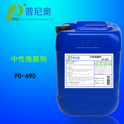 PO-690清洗预膜剂是由具有螯合、清洗、分散、成膜等作用的药剂复合而成,PO-690清洗预膜剂具有清洗和预膜的双重作用,在应用过程中具有清洗速度快、清洗效果好、成膜速度快、成膜致密均匀,腐蚀率低等优点。PO-690清洗预膜剂对各种水质的适应力强,不受水中的铁、铜等有害离子的干扰,适用于循环冷却水系统的清洗预膜,尤其是循环水系统的不停车清洗预膜。