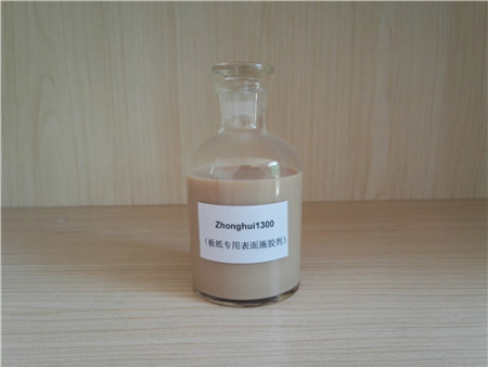 Zhonghui1300板纸专用表面施胶剂是由国内知名专业院校数名研究生、博士根据国际流行先进的、针对我国目前板纸实际原料结构和实际生产最新研制的一种新型施胶剂,具有极强的成膜性和良好的抗水性能。用于涂布白板纸、牛皮箱板纸、牛卡纸、瓦楞原纸、白卡纸等的生产,可显著提高纸板表面抗水性、环压强度、减少纸张涂布时的掉毛掉粉,提高产品的等级。