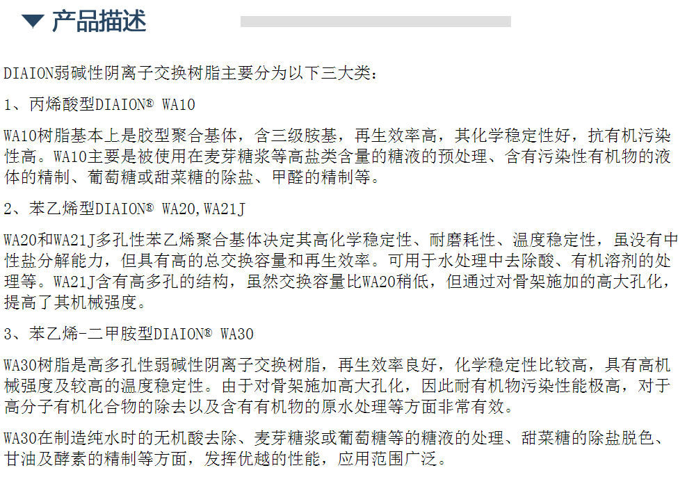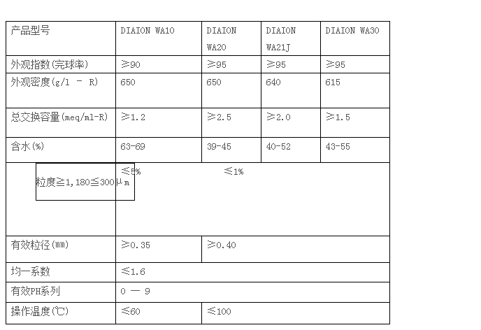 DIAION WA 系列 (弱碱性阴离子交换树脂)