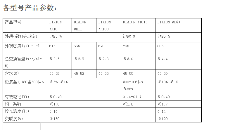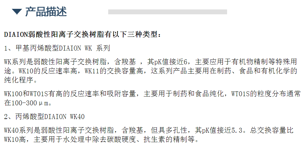 DIAION WK 系列 (弱酸性阳离子交换树脂)