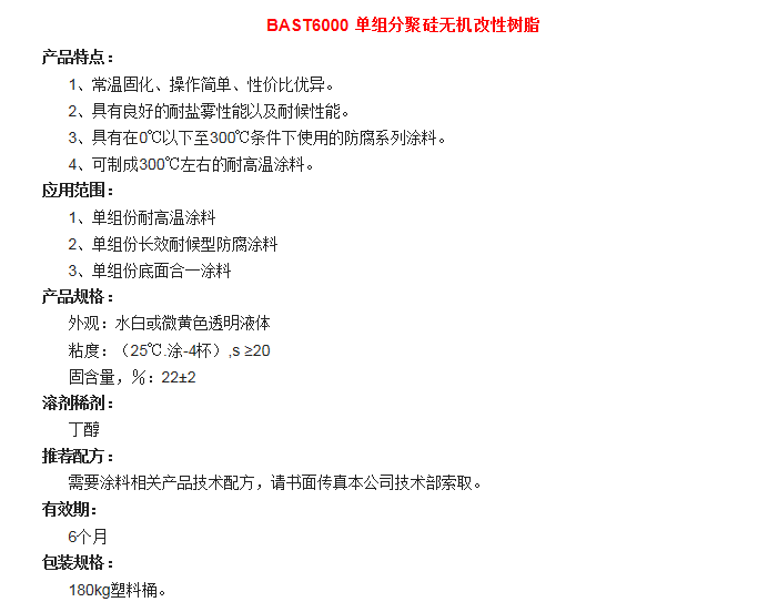 湖北巴斯特 BAST6000 单组分聚硅无机改性树脂