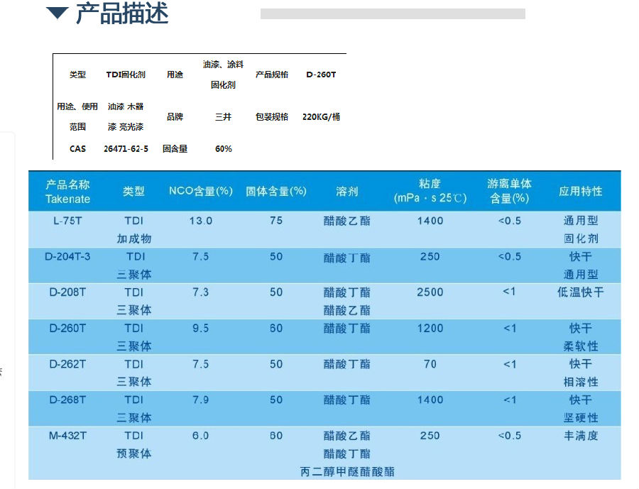 三井固化剂D-260T/TDI固化剂|干燥快|柔软性好|常用亮光
