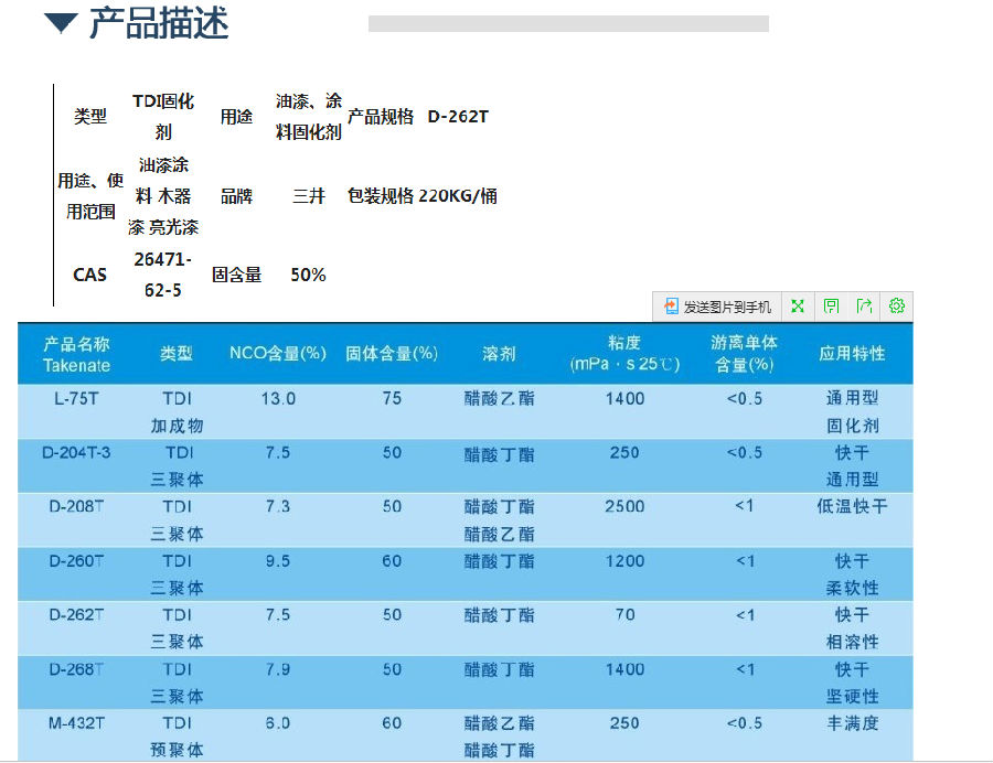 三井固化剂D-262T|TDI三聚体固化剂|快干相溶性|粘度低