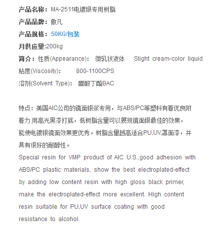 上海傲凡 MA-2511电镀银专用树脂