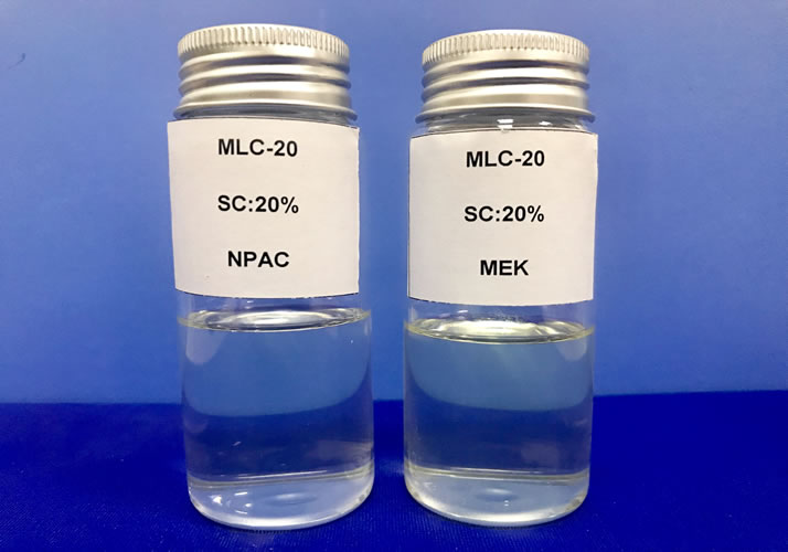 溶解性:通常MLC-20溶解于相对强的溶剂/稀释剂组合中,如酮溶剂/芳烃稀释剂(50/50重量%)也能很好的溶解于弱极性溶剂中如醋酸乙酯,醋酸丁酯。氯化烃如二氯乙烷和1,2-二氯乙烷可以完全溶解MLC-20,而三氯乙烷和四氯乙烷对其溶解性能相对较弱。芳香烃对MLC-20有很好的溶胀作用,一般与酮类溶剂配比使用。MLC-20具有更大的溶解度,在酮溶剂/芳烃稀释剂中可达到30%的固体份的树脂溶液。