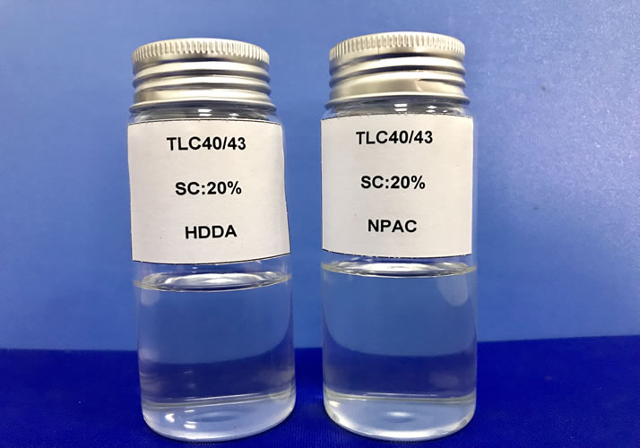 溶解性:在UV体系中可以很好的溶解于HDDA,TMPTA等单体中,做成10-40%的固体分的树脂溶液,也能一部分溶剂一部分单体的溶解,以达到更高的固体分。通常TLC-40/43溶解于相对强的溶剂/稀释剂组合中,如酮溶剂/芳烃稀释剂(50/50重量%)也能很好的溶解于弱极性溶剂中如醋酸乙酯,醋酸丁酯。TLC-40/43具有更大的溶解度,在酮溶剂/芳烃稀释剂中可达到30%的固体份的树脂溶液。
