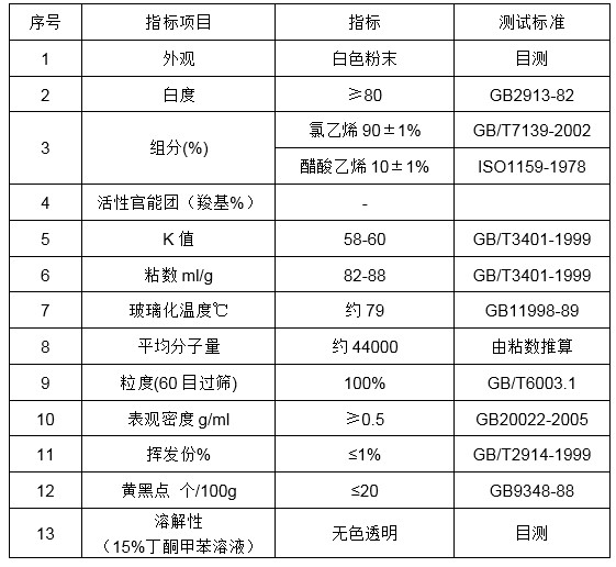 特性:高分子量二元氯乙烯-醋酸乙烯树脂, 具有大致组成为90%氯乙烯及10%醋酸乙烯,平均分子量大约为44000,K值约为58, 通常溶于13%-18%固体份的树脂溶液,在酯类溶剂中需要适当的延长分散时间或者适当加热溶解,也同样有很好的溶解性能。提供良好的成膜性、溶剂释放性、高硬度、高韧性、及高耐化学品性,抗拉斯。