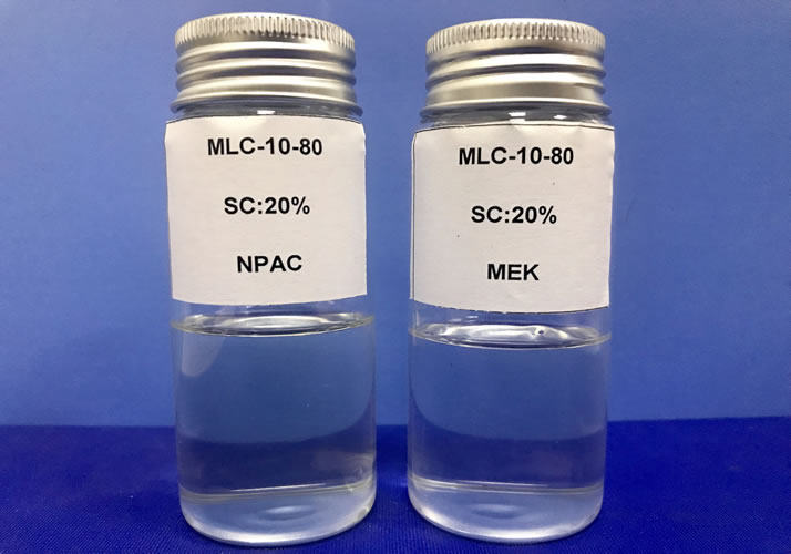 溶解性: 酮类、氯代烃和酯类溶剂是MLC-10-80最常用的溶剂。MLC-10-80能迅速溶解于丙酮、丁酮、甲基异丁基酮和环己酮中。氯化烃如二氯乙烷和1,2-二氯乙烷可以完全溶解MLC-10-80,而三氯乙烷和四氯乙烷只能使其溶胀。酯类溶剂,可通过加热或者高速分散延长溶解时间来溶解,其溶解性比酮类稍差,但是其酯溶性比悬浮法的LC-10-80好,加入酮类作为共溶剂可以避免这种情况。为了提高固体份和改善性能,MLC-10-80可以与我司的其他型号的氯醋树脂混合使用芳香烃对MLC-10-80有很好的溶胀作用,醇类和脂肪烃类不能溶解。