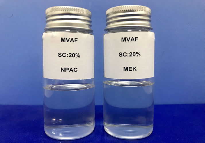 溶解性: 酮类、酯类对MVAF是特别好的溶剂,不仅能溶于酮类溶剂中,也完全能溶于酯类溶剂,溶液无色透明或微黄;其中具有优异的酯溶性能是新品MVAF的特色和亮点,酯类溶剂如乙酸乙酯、正丙酯等。