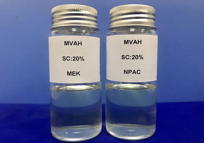 溶解性: 酮类、酯类对MVAH是特别好的溶剂,不仅能溶于酮类溶剂中,也完全能溶于酯类溶剂,溶液无色透明或微黄;其中具有优异的酯溶性能是新品MVAH的特色和亮点,酯类溶剂如乙酸乙酯、正丙酯等。