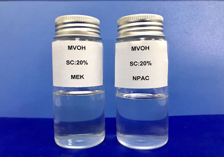 溶解性:酮类对MVOH是特别好的溶剂,而酯类溶剂相对较弱。氯化烃如二氯乙烷和1,2-二氯乙烷可以完全溶解MVOH,而三氯乙烷和四氯乙烷只能使其溶胀。芳香烃对MVOH有很好的溶胀作用,一般与酮类溶剂配比使用,它可溶于相对强的溶剂/稀释剂组合中,如50%酮和50%芳烃,产生含固量25%-28%的树脂溶液,MVOH树脂溶液的粘度和其他特征与 VAD非常相似,由于其较低的分子量,在溶剂中有更大的溶解度,可以配置固含量较高的树脂溶液。