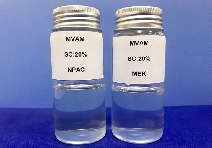溶解性:酮类对VAMA是特别好的溶剂,而酯类溶剂相对较弱。氯化烃如二氯乙烷和1,2-二氯乙烷可以完全溶解VAMA,而三氯乙烷和四氯乙烷只能使其溶胀。芳香烃对VAMA有很好的溶胀作用,一般与酮类溶剂配比使用。VAMA通常溶于相对强的溶剂/稀释剂组合中,如50%酮50%芳烃,生成22%-25%固体份溶液。
