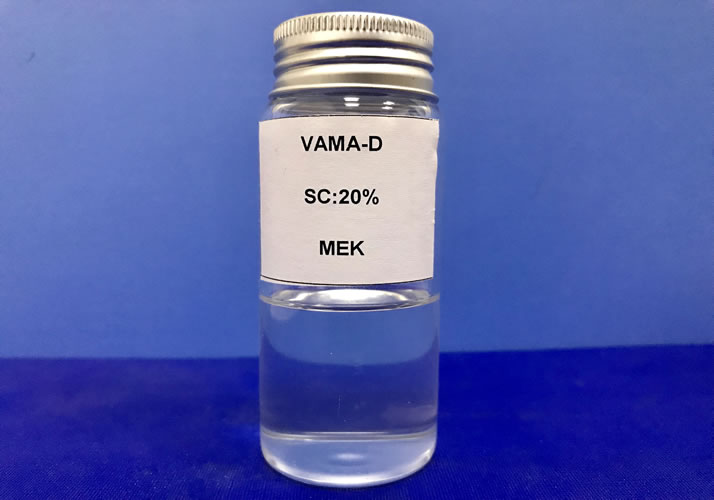 溶解性:酮类对VAMA-D是特别好的溶剂,而酯类溶剂相对较弱。氯化烃如二氯乙烷和1,2-二氯乙烷可以完全溶解VAMA-D,而三氯乙烷和四氯乙烷只能使其溶胀。芳香烃对VAMA有很好的溶胀作用,一般与酮类溶剂配比使用。VAMA-D通常溶于相对强的溶剂/稀释剂组合中,如50%酮50%芳烃,生成22%-25%固体份溶液。