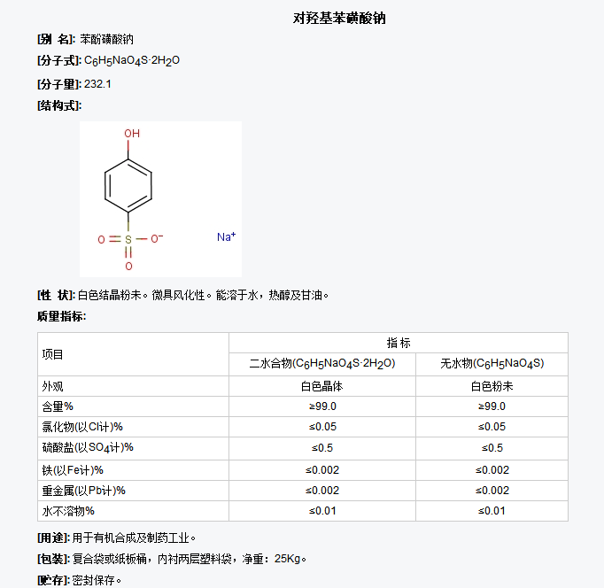 南通环宇 医药中间体 对羟基苯磺酸钠 [别 名]: 苯酚磺酸钠