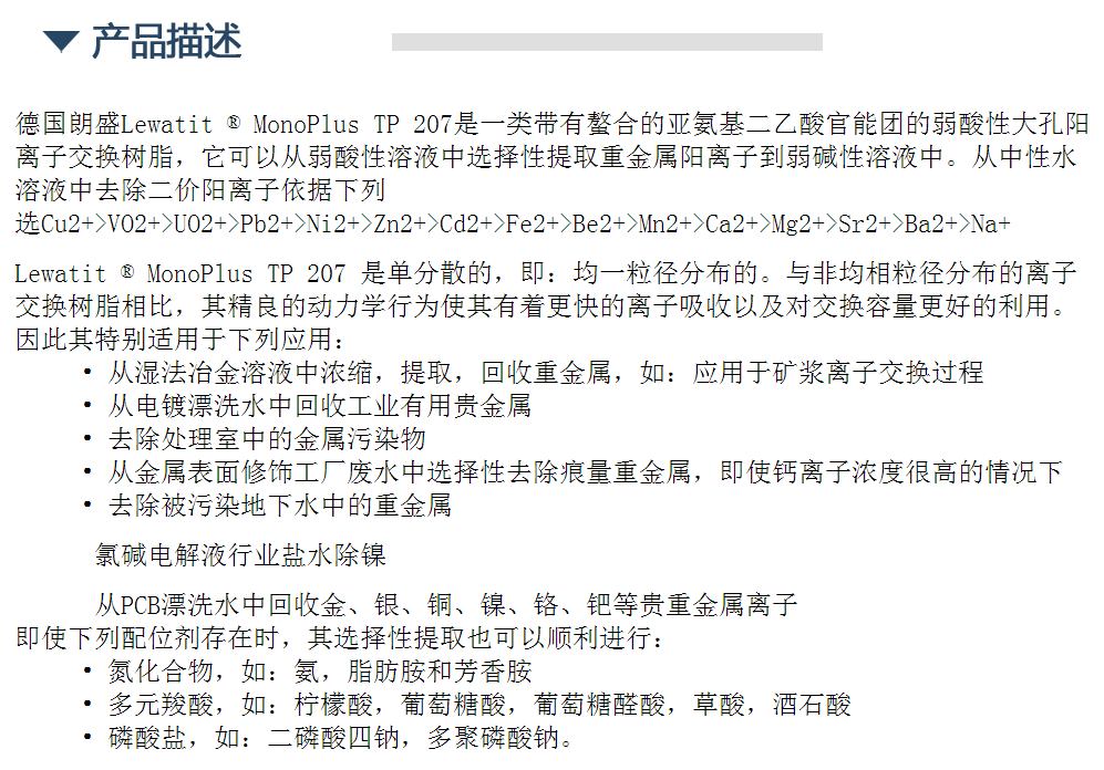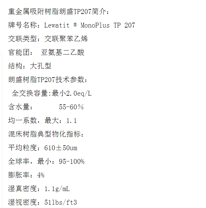 朗盛螯合金属离子吸附树脂重金属吸附树脂TP207