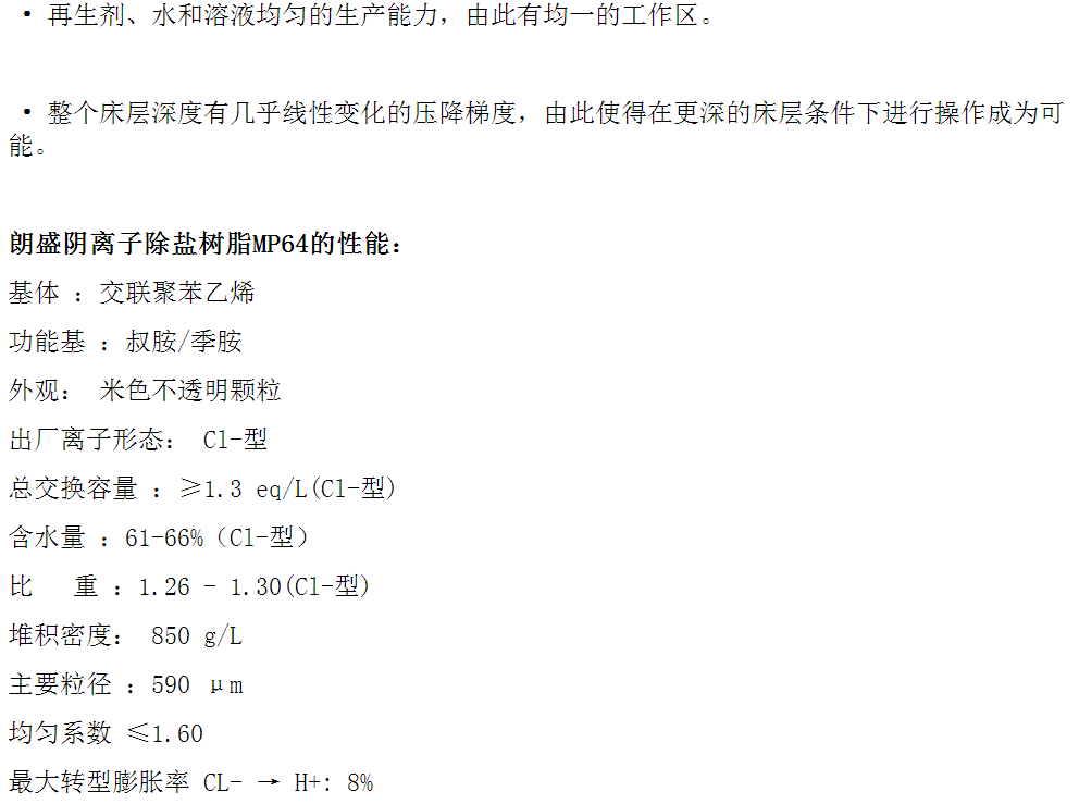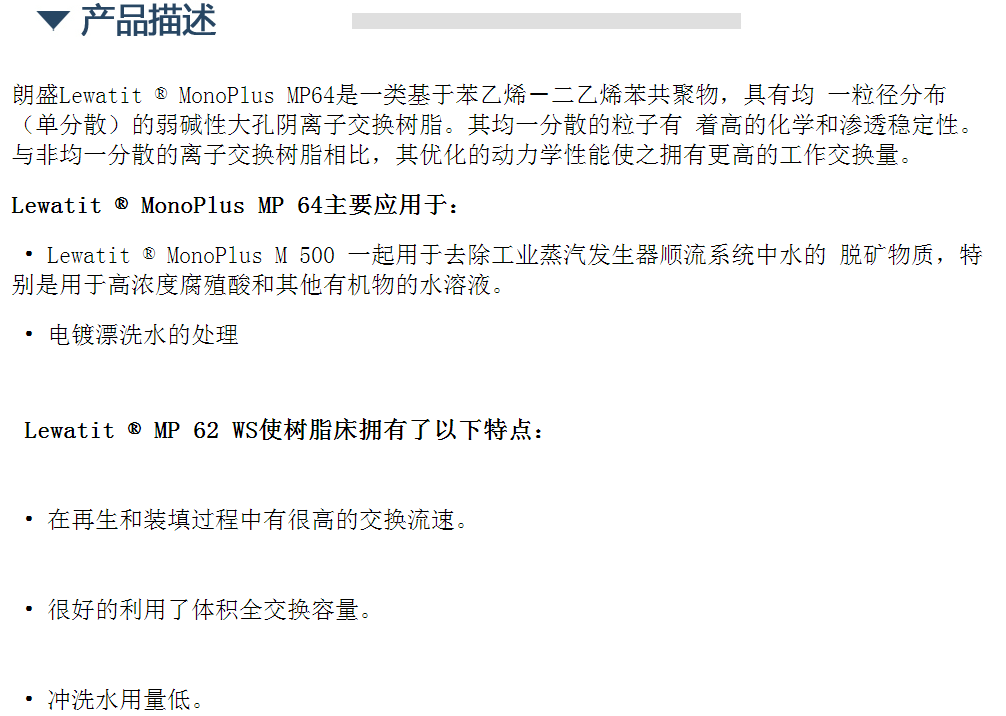 朗盛弱碱性大孔阴树脂混床除盐树脂螯合树脂 MP64