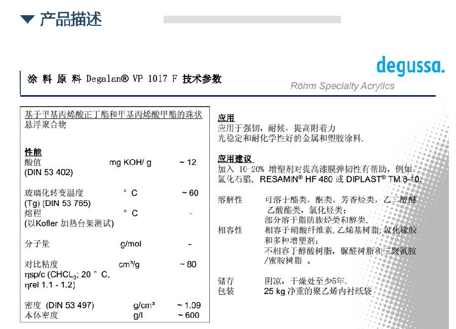 德固赛固体丙烯酸树脂DEGALAN VP 1017 F