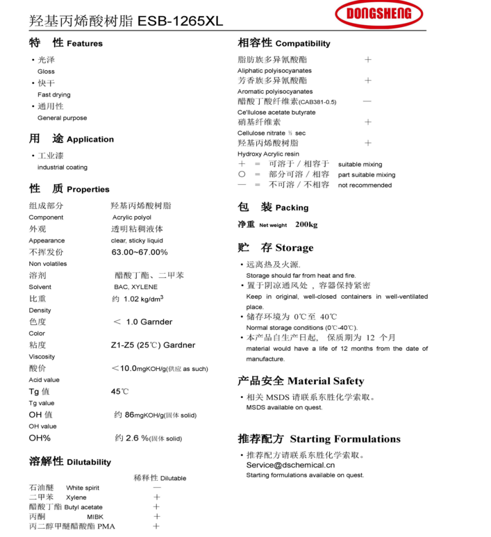东胜化工(上海)羟基丙烯酸树脂ESB1265XL