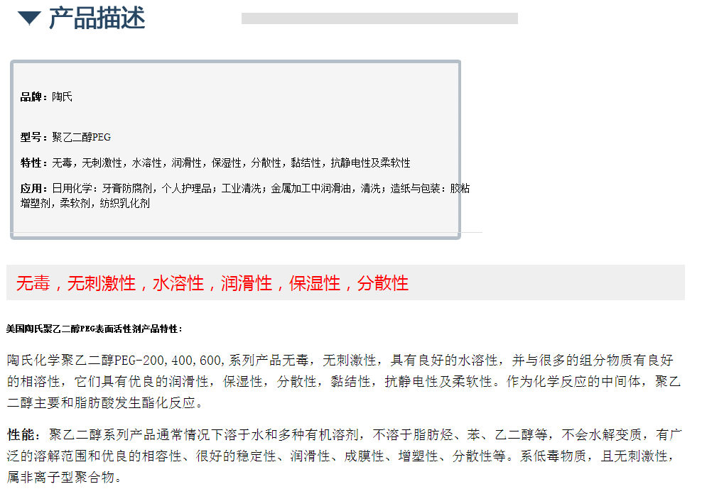 陶氏聚乙二醇PEG 表面活性剂