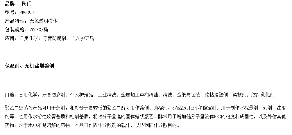 美国陶氏聚乙二醇PEG200 原装进口