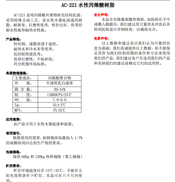 江门市聚力 水性涂料树脂木器树脂 AC-221水性丙烯酸树脂