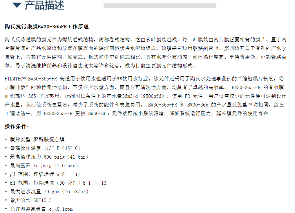 陶氏 FILMTECTM BW30-365-FR 抗污染型反渗透元件