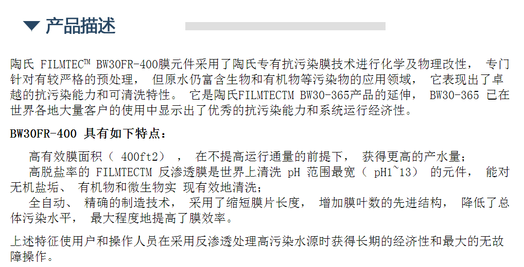 陶氏 FILMTECTM BW30FR-400 抗污染型反渗透元件