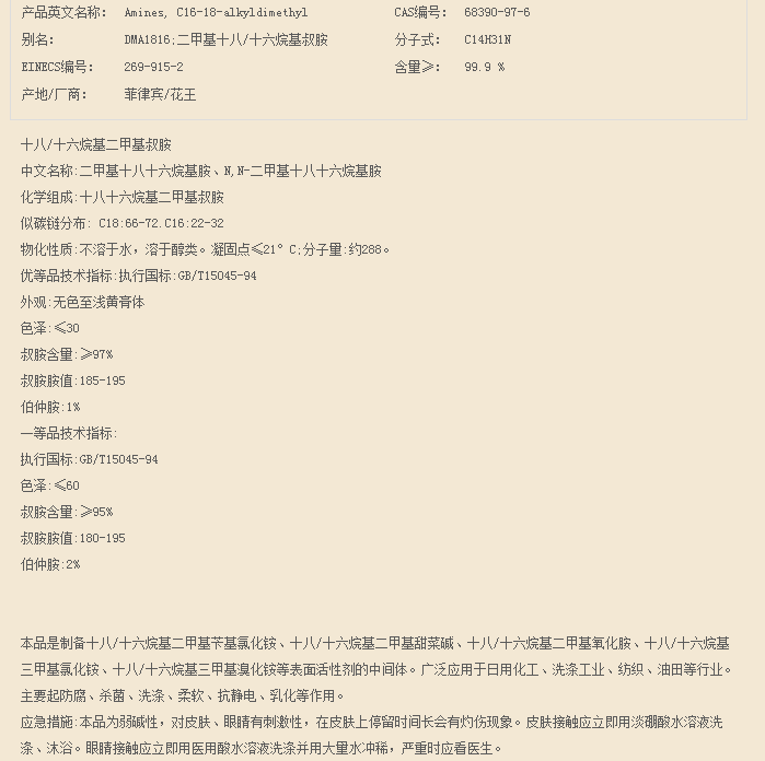 山东攀泽 脂肪烷基叔胺系列 十八/十六烷基二甲基叔胺