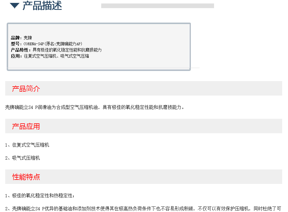 壳牌CORENA(确能立)S4P合成型往复式空压机油