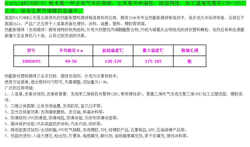 博力肯物理发泡剂180DU45(高温型) 美国进口羊巴粉 热膨胀塑料微珠