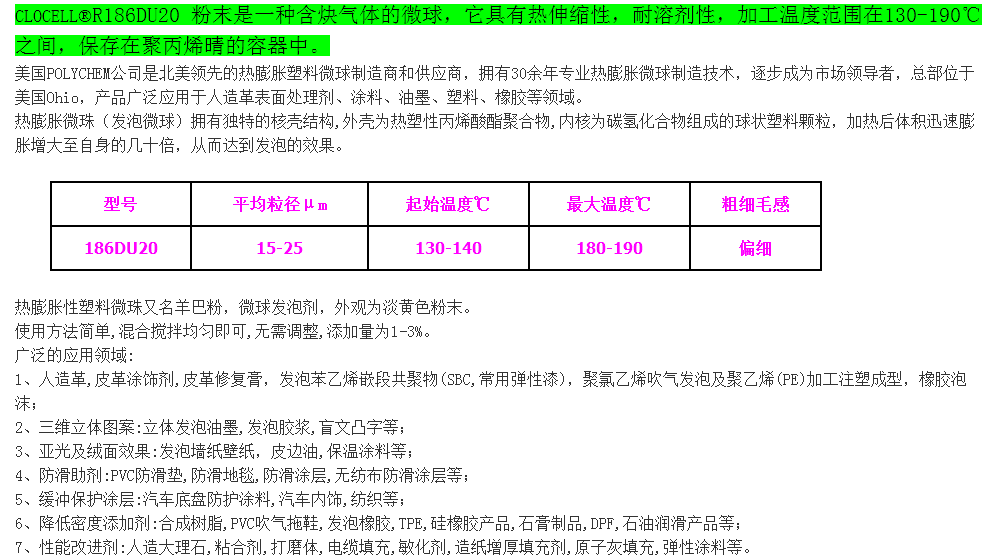 博力肯物理发泡剂186DU20(高温型) 美国进口羊巴粉 热膨胀塑料微珠
