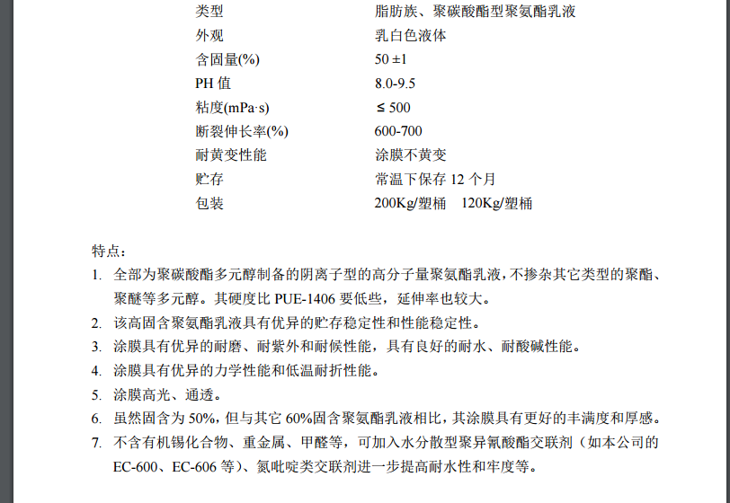 上海思盛 高固含(50-60%)涂层用水性聚氨酯乳液 PUE-1407