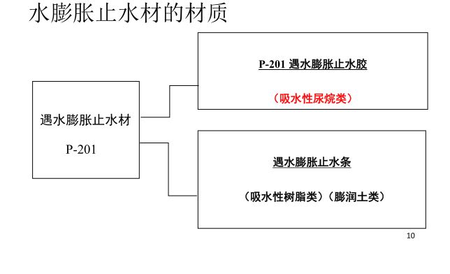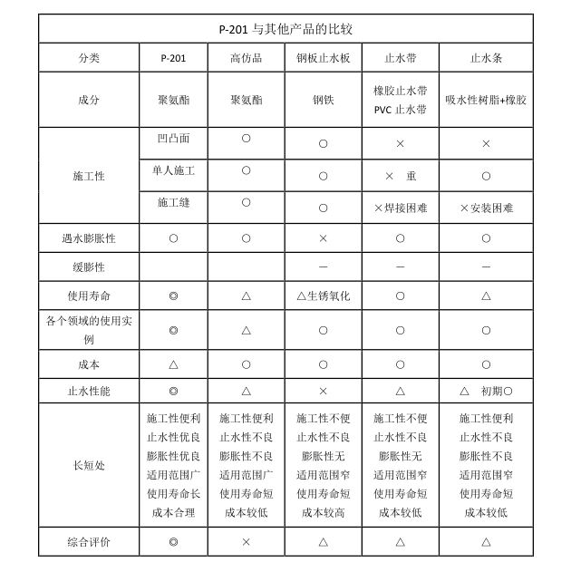 P-201遇水膨胀止水胶(简称P-201)是一种遇水膨胀、单液、弹性密封胶。它以聚氨酯的预聚体为基础、含有特殊接枝的尿烷。具有橡胶的弹性止水和遇水后自身的体积膨胀止水的双重密封止水机理,适用于混凝土施工缝防水和各类预埋构件的防渗漏。