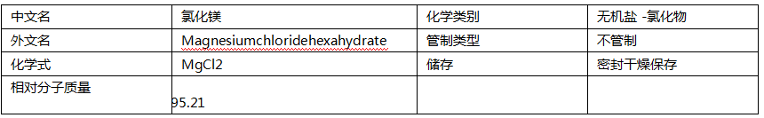 通常含有六个分子的结晶水,即MgCl2·6H2O,易潮解。有苦味,有腐蚀性。用于制金属镁、消毒剂、冷冻盐水、陶瓷,并用于填充织物、造纸等各方面。