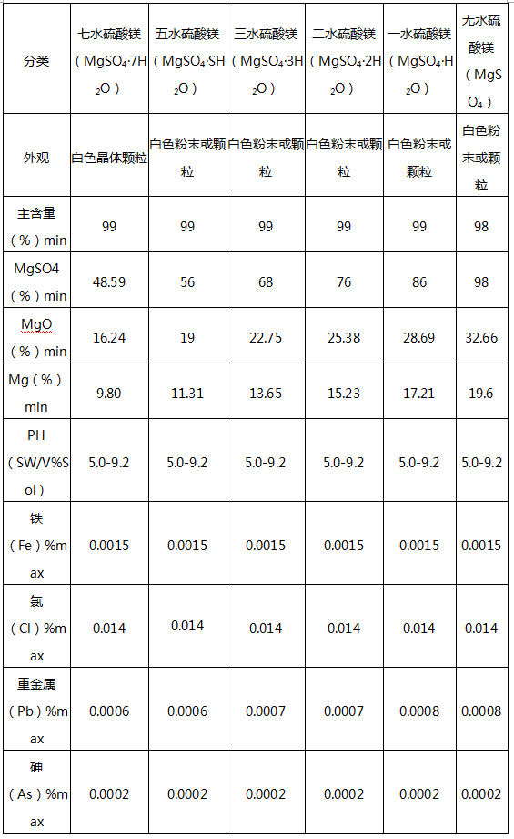 七水硫酸镁有工业级和饲料级,颗粒状,根据大小有0.1-1mm,1-3mm,2-4mm三种。其他如无水、一水、二水、三水硫酸镁均为粉末状。