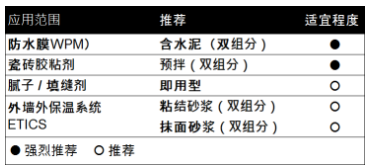VINNAPAS? 547 ED (NJG) 与其它乳液(比如苯乙烯-丙烯酸酯乳液和纯丙烯酸乳液)相容,并且特别适合用于防水膜、瓷砖胶粘剂、外墙外保温系统、界面剂、粘接剂以及水泥外加剂等。有关 VINNAPAS? 547 ED (NJG) 的典型应用领域,可参阅以下应用列表。更多应用信息,请联系瓦克客户服务代表。