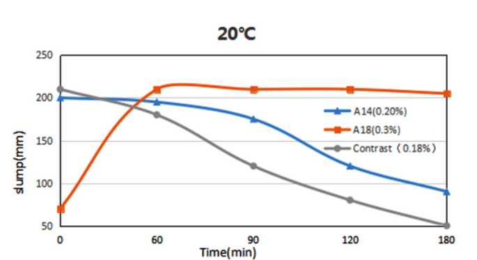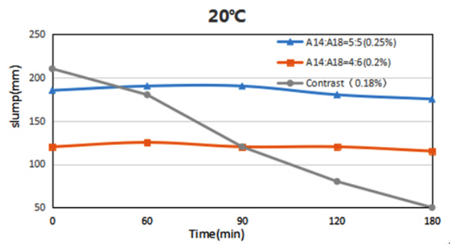 根据客户的不同需求,A14、A18以不同比例配置后,能兼顾两种母液的性能优势,达到更好的工作性能,甚至可以达到低坍落度保坍的特殊要求。