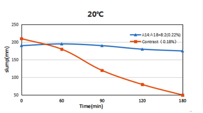 根据客户的不同需求,A14、A18以不同比例配置后,能兼顾两种母液的性能优势,达到更好的工作性能,甚至可以达到低坍落度保坍的特殊要求。
