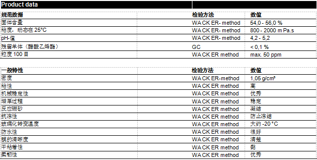 二元共聚物和VINNAPAS 共聚物乳液。粘度和流变性可通过加入改性剂来改善,例如聚乙烯醇,纤维型增稠剂,淀粉和海藻酸盐,丙烯酸酯乳液或连接性增稠剂。