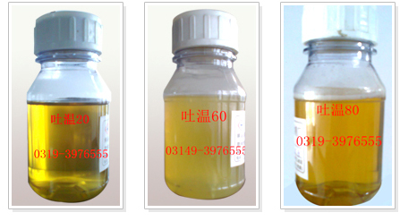 商品名称:吐温Tween 化学成份:失水山梨醇脂肪酸酯聚氧乙烯醚 性能及用途:本系列产品为黄色油状液体或蜡状固体,无毒无刺激,且具有一定的水溶性,并溶于多种有机溶剂。由于本系列产品具有优良的乳化、润湿、分散和渗透性能,因而,作为乳化剂、润湿剂、分散剂和渗透剂等,在化妆品、食品加工、制革工业、化纤油剂、农药、印染、金属加工、炸药等行业有着广泛的应用。
