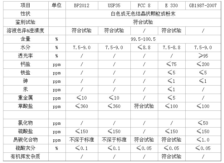 产品名称: 柠檬酸产品性状: 白色晶体粉末执行标准: BP2012/USP35/FCC8/E330/GB1987-2007包 装 : 纸塑复合袋或三层牛皮纸袋包装,每袋净重25公斤;储 存 : 清洁、阴凉、干燥、通风处储存主要用途: 主要用于食品、饮料行业作为酸味剂、调味剂及防腐剂、保鲜剂。还在化工行业、化妆行业及洗涤行业中用作抗氧化剂、增塑剂、洗涤剂等。