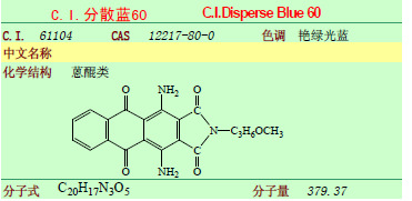 名称:分散翠蓝 S-GL;又名:分散湖蓝 S-3GL;C.I.Disperse Blue 60 分子式:C20H17N3O5 分子量:379.37 CAS号:12217-80-0 性质:蓝黑色粉状。不溶于水,微溶于乙醇,溶于吡啶、丙酮和甲基酰胺。