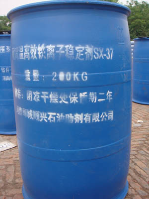 酸化用铁稳定剂SX-37 | | 用处/特征 | 该剂加入酸化解堵液中,用以稳定三价铁离子,防止酸变为残酸时,生成絮状的沉淀污染堵塞油层。 | 技术指标 | 项目 | 指标 | 实测数据 | 单项结论 | 备注 | 外观 | 微黄色透明液体 | 微黄色透明液体 | 合格 | | 密度,g/cm3 | 1.05—1.26 | 1.0 | 合格 | | PH值 | 2.0—7.0 | 2.1 | 合格 | | 络合Fe3+能力,mg/mL, | ≥40 | 44 | 合格 | | 水溶性(1%水溶液) | 均匀分散体系 | 均匀分散体系 | 合格 | |