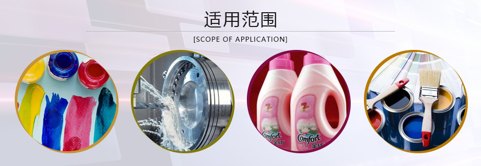 应用于水性涂料、乳胶漆、聚合物乳液、粘合剂、瓷釉、填充剂、密封胶、金属加工液、衣物洗涤剂(洗衣液、洗手液等碱性洗涤产品)等诸多生产领域的水性产品在湿态时的防霉抗菌,尤其适合南方高温季节,PH值较高及环保配方涂料乳液行业及胶黏剂行业的产品。
