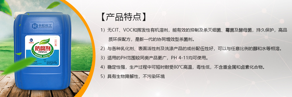 1)无CIT、VOC和挥发性有机溶剂,能有效的抑制及杀灭细菌、霉菌及酵母菌,持久保护,高品质环保配方,是新一代的协同增效型杀菌剂。