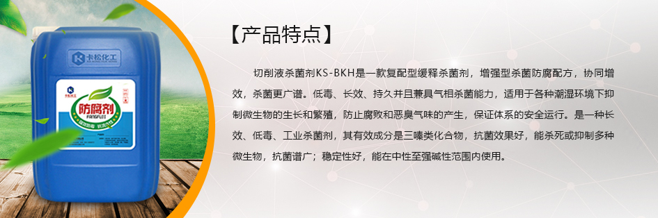 切削液杀菌剂KS-BKH是一款复配型缓释杀菌剂,增强型杀菌防腐配方,协同增效,杀菌更广谱。低毒、长效、持久并且兼具气相杀菌能力,适用于各种潮湿环境下抑制微生物的生长和繁殖,防止腐败和恶臭气味的产生,保证体系的安全运行。是一种长效、低毒、工业杀菌剂,其有效成分是三嗪类化合物,抗菌效果好,能杀死或抑制多种微生物,抗菌谱广;稳定性好,能在中性至强碱性范围内使用。